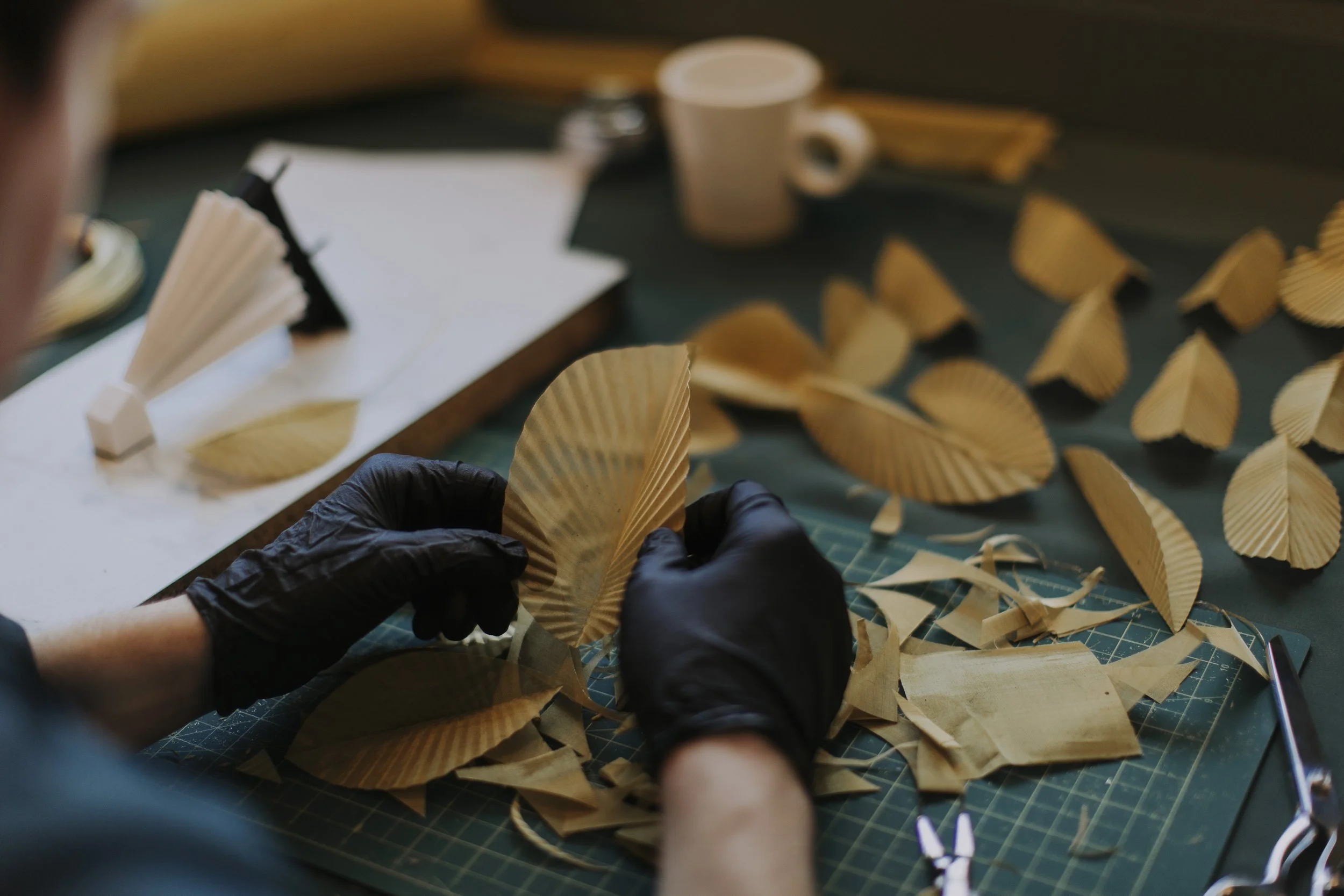 Saule is a handcrafted lighting fixture inspired by the willow tree's beauty. Made in our Verchères studio, it features cascading brass leaves and a pink glass globe that emits a soft, warm glow. The mobile-like structure moves gently with the air, creating an ethereal ambiance. Available in Large or Small and in one, three, or five fixture configurations, Saule adds natural elegance and serenity to any space.